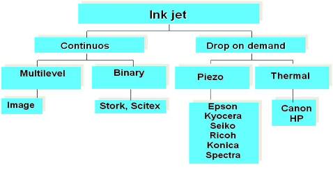 噴墨技術(shù)分為連續(xù)噴墨和按需噴墨(DOD)兩種,前者目前只用在柯達(dá)的數(shù)字印刷機(jī)上,市場(chǎng)上的絕大部分噴墨打印機(jī)都屬于按需噴墨技術(shù),按需噴墨又分為壓電和熱發(fā)泡兩類,熱發(fā)泡噴頭廉價(jià)、精度高,但其缺點(diǎn)也是顯而易見的:噴頭壽命短、只適用水性墨水,因之主要用于家庭和辦公室的紙張打印;而壓電噴墨是利用陶瓷加上電壓后會(huì)變形的原理,直接將電壓轉(zhuǎn)換為機(jī)械壓力,工作在常溫下,也無需溶解在水中的氧氣幫忙,所以不但噴頭壽命長(zhǎng),而且可以適用各種類型溶劑所生產(chǎn)的墨水。